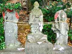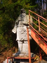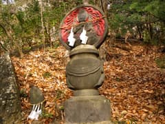 斜面の上の方にも点々と宗教モニュメントがある。特に道はないので、落ち葉を踏んで登ってみる。愛染明王は台座が球形なのが面白い。基部には「紺屋職人中」と刻まれていて、織都桐生らしく染物職人の信仰を集めていたようだ。