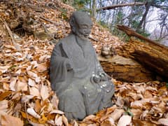 さらに上の斜面には「大江大権現」や「三笠山 御嶽山 八戒山」と刻まれた石碑、普寛行者の石像が点在する。普寛行者は武州大滝村に生まれ、木曽御嶽山の王滝口を開いた実在の人物だが、この行者像の表情も写実的でリアルだ。