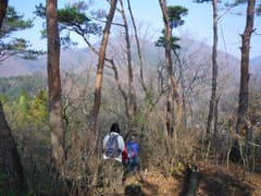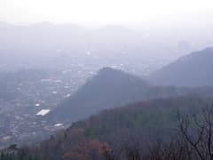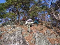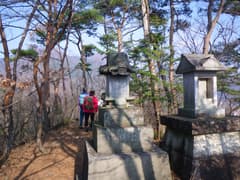 桐生市街の展望を背負って、赤松の生えた岩場をさらに攀じ登る。頂上直下にも「御嶽座王大権現」の石碑がある。踏み跡が現れ、少し辿ると御嶽山の頂上に着いた。2基の石祠があり、それぞれ「白山妙理大権現 千手観世音 土地護伽藍神」と「桐心霊神」が祀られている。頂上は松林に囲まれているが、木立を透かして吾妻山が意外と高く聳えている。なお、この山を御嶽山と呼ぶのは通称で、元来は観音山と呼ばれていたそうだ(hisiyama さんから教示頂いた情報。光明寺では、観音様が降臨された山とされているとのこと)。
