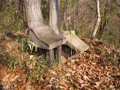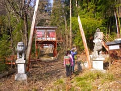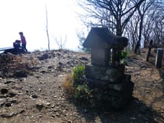 のんびり休憩したのち、さらに稜線を辿る。葉が落ちた雑木林の中の道は明るく快適だ。「みたけ神社、丸山下駅、桐生駅」というプレートのある分岐に着き、ここで青葉台への道と分かれて、左に折れる。分岐点には2基の石祠があり、1基の屋根は修復されてコンクリ製だが、どちらも年代は古いらしい。