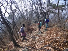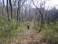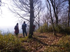 頂上のベンチに腰掛けて大休憩。美味しい干し柿など、いろいろ頂き物を食べる。しかし、まだ昼食には早いので、そろそろ次の目的地の御嶽山白龍神社に向かって腰を上げますか。吾妻山から南西の青葉台に続く稜線を辿る。この道も初めて歩くので、楽しみだ。