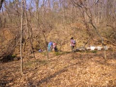 明るい雑木林の稜線を進むと、杉林の中の急な下りとなる。ひとしきり下ると再び緩い稜線となり、展望の良いピークに着くので、ここでランチタイムとする。眼下には市街地の中に丸山がぽっこりと浮かび、その向こうには渡良瀬川が銀色の帯となってうねり、八王子丘陵が長々と横たわっている。