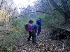 緩い谷間を下ると、道端に猪のぬた場がある。猪に擦られたのか、金精様の像のように磨かれた木の切り株があり、珍しい。メンバー一同、しげしげと観察。