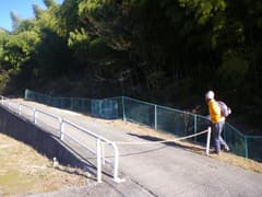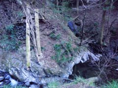 鷹林寺の駐車場に車を置いて出発。「やまの町桐生」の天竹山/愛宕山の記事によると、愛宕山への取り付きは『駐車場の脇を流れる沢のフェンスにつけられた扉を開き、水路に降ります。山側の三段の石積みを登ると水源涵養保安林の標柱の先に踏み跡があります。』とある。フェンスの扉はすぐに判ったが、水路の対岸の石積みの上には猪除けの金網の柵が張り巡らされている。ホントにここから登るの?他に通れるところはなさそうなので、ペラペラで錆びた柵を登って強引に越える。