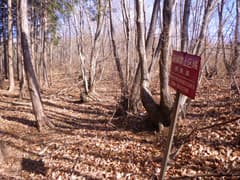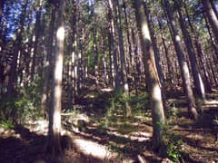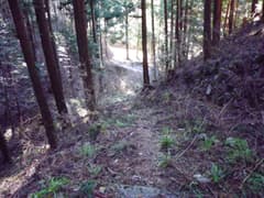 水源かん養保安林の標柱の先でもう一回猪除けの柵を越え、行く手の尾根を目指して杉林の斜面を直登する。しかし、どんどん傾斜が増して、滑落の危険さえ感じるような斜度になる。これはヤバい。回りを良く見渡すと、な〜んだ、斜めに登って行く山道があるじゃありませんか。
