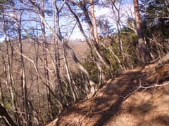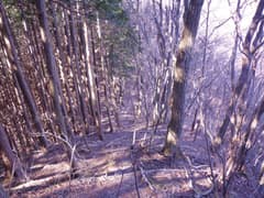 尾根を淡々と歩いて、571m標高点の南の鞍部に着く。地形図にはこの鞍部を越える破線が記載されているが、実際には峠道らしいものはない。西側に明るい雑木林の急斜面が落ちているだけである。