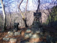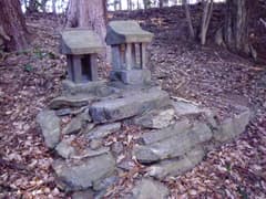 この山道を辿ると、急斜面をうまくジグザグに登って、疎らな雑木林に覆われた尾根の上にあっさり出た。橇道の跡を辿って緩く登ると、小広い平地に大小2基の石祠のある愛宕山頂上に着く。大きい方が愛宕神社で、台座に「梅田村大字二渡村氏子中」、「明治三拾八年拾壱月拾日遷宮」と刻まれている。小さい方は屋根正面の破風に「疱瘡神」とある。私にとっては初めて見る珍しい神様だが、後日調べると、江戸から明治時代にかけて広く信仰されていた神様らしい。