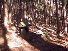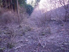 ここから東側に下れば、梅田ふるさとセンター発のバスにちょうど間に合いそうだが、時間も十分にあるので、西側の大茂(だいもん)に下ることにする。下り始めはしっかりとした踏み跡があるが、すぐに沢に突き当たって道は消滅する。沢筋に沿って下り、杉林に入れば再び踏み跡が現われて、程なく忍山林道に飛び出た。