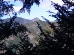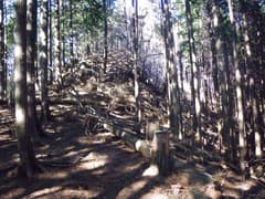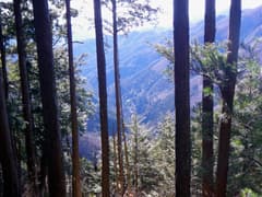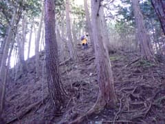 ここから今日のコースの最後のピークへの急登となる。この無名峰の頂上も杉林に覆われて、展望はほとんどない。わずかに忍山川流域の湯本の集落の屋根が、眼下に光って見えるくらいだ。