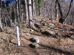 愛宕山からさらに北へ尾根を辿ると、こちらには参道らしいはっきりとした道型が付いている。石祠を過ぎ、道型から離れ、伐採された枝が小うるさい稜線を僅かに辿ると天竹山のピークに着く。木の間から鳴神山がわずかに見えるだけの何とも冴えないピークで、完全に名前負け(^^;)。ここから稜線を少し下ると、点名・猿石(せりし)の三角点(標高392m)の標石がある。ここはピークですらなく、緩い下りの途中だ。ピークハント?して天竹山に戻り、北の寄日峠に向かって縦走を開始する。