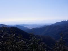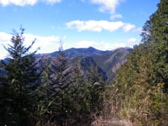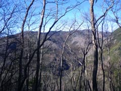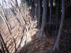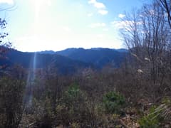 尾根を境に左は概ね杉林、右は雑木林が広がっている。藪がない緩い尾根なので歩き易い。ところどころから、仙人ヶ岳から高戸山かけての山並みが見える。