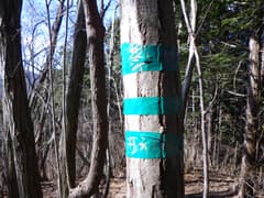 ここから少し急な坂となり、地図上の距離の割には時間がかかって、雑木林に囲まれた571m標高点に登り着く。立ち木の幹には「蕪丁」と書かれたテープが巻かれていて、この辺りを何度も歩いているhisiyamaさんが残したものらしい。