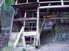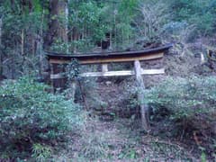 忍山林道を少し下ると、廃旅館のある大茂で、急ぎ足で通過。前回はこのすぐ先から車で帰ったため、見逃したポイントがある。数軒の民家がある湯本の集落を過ぎると、道端に朽ちかけた鳥居がある。ここがお目当てのポイントの温泉神社だ。鳥居を潜り、薄暗い樹林の中の苔むした石段を登ると、傾きかけた山門の奥に社殿がある。怪しい雰囲気が横溢。社殿の中は真っ暗で見難いが、「薬師瑠璃光如来」、「湯泉大權現」と書かれた幟が奉納されている。
