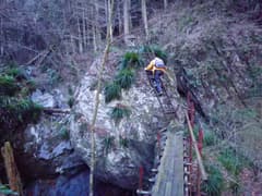 怖〜い温泉神社の探索を終えて忍山林道を下って行くと、忍山川はなかなかの渓谷となって、石祠を祀った丸い巨岩(弁天島)が川の中に立つ。すぐ上流には滝(弁天滝)や朽ちて落ちた木橋があり、ここが蕪丁の入口らしい。興味しんしん。弁天島には桟橋と梯子が掛かっていて、石祠にお参りできる。ここも車では通過してしまいがちなポイントだ。
