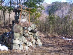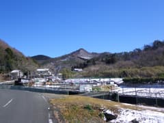 途中のコンビニで昼食用にパンとペットボトル飲料を仕入れ、住吉峠を越えて小友川に出る。御嶽山(姥穴山)の山麓に民家が点在する長閑な場所だ。小友川の奥には、高萩山の端正な三角形のピークが斑な雪模様で佇んでいる。地元の方々が、自動車鈑金塗装工場の大きなガレージに三々五々集まっていて、中から何やら美味しそうな匂いが漂い出ている。先日、掲示板への書き込みで、この時間に近くの山の神でお祭りと宴会がある、という情報を石塚さんから頂いた(←今回の山歩きを思いついたきっかけ)。風が強く寒いので、宴会は屋内ですることになったのだろう。
