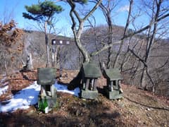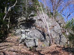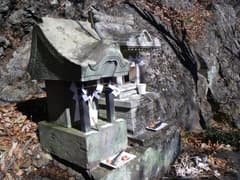 舗装道は右折して小友川を渡り、白葉峠へ登って行く。そちらの道は、馴染みのジョギングコースだ。今日は川沿いの砂利道を直進する。すぐに左手に岩場があり、基部に2基、中腹に1基の石祠がある。すぐそこまでは頻繁に来ているのに、ここに岩場と石祠があるとは気がつかなかった。