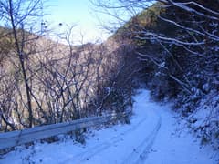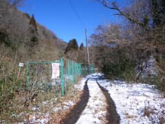 山の神にお参りできたので、今日の山歩きの当初の目的は達成。ついでに、小友川の奥がどんなところか、林道をさらに上流へ辿ってみることにする。フェンスで囲まれた釣り堀の跡を左手に見て、雪の積もった林道を辿る。雪道に新しい轍があるのは、誰の物だろうか。この先には人家はないはずだが…