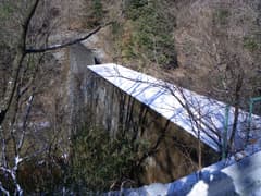 杉林を抜けると、大きな砂防堰堤がある。ここまでは、以前にジョギングで来たことがある。夏だったので、蚊に刺されまくって退散した。もちろん、今日は全然いない。堰堤のバックウォーターも水嵩が少ない。4WDが降りて来たので、轍の主はこれだろう。単に雪の林道が走りたかったようだ。