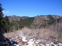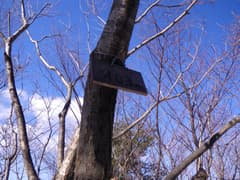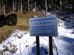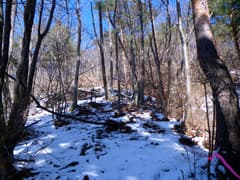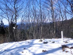 吹きさらしの県境稜線を仙人ヶ岳方面に辿ると、伐採地が終わって雑木林と杉林に挟まれた尾根になる。やはりこういう風情でないと、里山歩きは楽しくない。雪を踏んで登って行く。右手の枝尾根の上には、ちょっとした鋭峰があって目を引く(あのピークには、何かありそうだなあ)。赤松の生えた急坂を登ると、一色展望台と仙人ヶ岳の分岐点に着く。今日はごく軽い山歩きのつもりなので、仙人ヶ岳まで行くのは止めて、左の一色展望台への尾根道に入る。