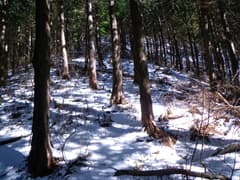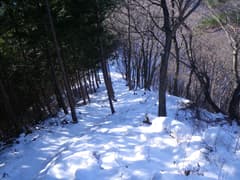 すぐに林道の分岐点に着き、林道小友線の看板がある。吹き溜まりの雪が深くなって来たので、ここでスパッツを着ける。分岐を左に進むとわずかな距離で終点となり、ここから杉林に覆われた尾根を登る。藪は薄いが、枯れ木の小枝が煩わしい。