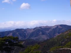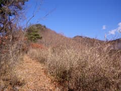 頂上から急な赤松の尾根を、張られたロープを手摺にして下る。傾斜が緩むと、眺めの良い尾根道となる。ここまで下れば、山に遮られて風もない。