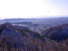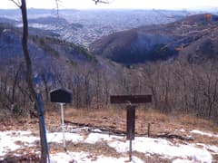 このすぐ先が一色展望台だ。こちらの展望は、桐生市街を見おろして相変わらず素晴らしい。八王子丘陵の茶臼山が、意外と鋭い山容を見せている。遠景には、西上州から奥秩父にかけての山々が霞んで見えている。展望台の登山ノートが補充されていたので、記帳させて頂く。相変わらず風が強く、うっかりするとノートを飛ばされそうになる。