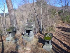尾根の末端近くには貴船神社があり、高い石組みの上に貴船宮と刻まれた石祠がちょこなんと祀られている。このすぐ下にも3基の石祠が並ぶ。月山、羽黒山、文化二乙丑年(1805年)七月吉日、下野國足利郡小友村と刻まれているので、こちらは湯殿山神社だろう。