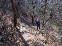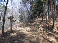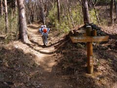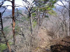 往路の岩場を下るのは、Mさんにとってはまだちょっと無理ということで、北側から東山麓に下ることにする。北に稜線を辿ると痩せた尾根となり、行く手に高王山が見える。余力があれば高王山を往復することも考えていたが、リハビリにはもう十分ということで割愛し、途中から右に分岐する登山道を降りる。