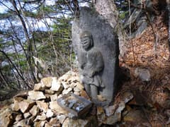 林道終点からの登山道を合わせると、道端に不動明王像があり、お賽銭をたくさん集めている。手摺にロープが張られた岩場を登ると、三基の大きな石尊祠が祀られる戸神山の頂上に飛び出た。