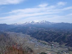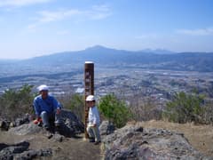頂上から一番目立つのは、ゆったりと残雪の稜線を広げる武尊山だ。双眼鏡で覗いてみると、川場や玉原のスキー場で滑っている人々が点々と見える、視野を左に転じると、テーブル状の三峰山が長々と寝そべる。三峰山の右端に少しのぞいているのは谷川岳、左端の遠くの真っ白な山は白砂山か。西には山麓の長閑な田園風景が広がり、その向こうに子持山がゆったりと裾野を広げている。そちらにカメラを向けたら、おじいさんに背負われて上がって来た男の子がキメのポーズをとってくれた。キャッワィー!