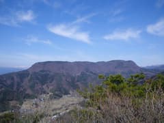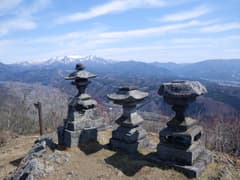 頂上には既に数組のハイカーさんがいて、360度の展望を楽しんでいる。春霞がかかっているものの、展望が売りの山だけあって素晴らしい。正午には間がある時間だが、折角の大展望なので大休止して昼食の時間にする。Mさんから頂いたおにぎり、卵焼き、バナナを頰張りつつ、山岳展望を楽しむ。