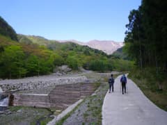 猿川に出ると、広大な河原の奥に高々と長七郎山が聳え、なかなか雄大な景観が展開する。周囲の山々の新緑が綺麗だ。猿川には新しい自然石護岸と砂防堰堤が連続し、かなり奥まで工事用車道が通じている。