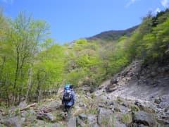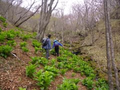 ここから、コバイケイソウの生えた沢を登る。右寄りに登って行くと水流が消えて小尾根上の登りとなり、長七郎山の東面を横断する工事用道路に出る。見上げる長七郎山は崩壊した斜面が広がり、道路もあちこち崩れている。通行には支障はなく、緑に覆われた山麓を見おろしながら歩く。