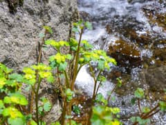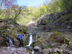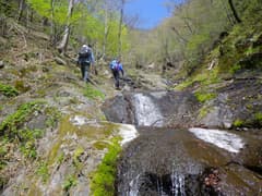 猿川の両岸は火山らしい脆い岩肌が続く。やがてナメ状の岩盤が現われ、小さな滝がいくつか続く。このあたりは新緑を眺めながら容易に遡れて楽しい。