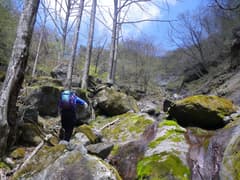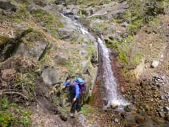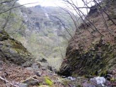 急峻な斜面が登れずに右へ右へとトラバースしていくと、本流源頭に近い岩壁に阻まれて、もうトラバースはできない。意を決して登り始める。木立に体重をかけて垂直に近い壁を強引に登って行くが、脆い岩肌に辛うじてへばりついている木は、いつ引っこ抜けてもおかしくない。トップを行くHさんは岩壁の弱点を縫って右へ左へと進路を変えるが、もし登れない岩壁に突き当たって行き詰まったらどうしよう。ここを降りるのは、登るより困難だ。ようやく傾斜が緩くなって、滝の上部に抜けた時はホッとした。