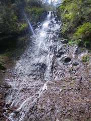 すぐ上に落ちている上段の滝は、下から一見するとあまり落差がありそうに見えないが、黒光りする岩盤の上を幾筋にも分かれた水流が流れ落ちていて、三段の滝の中では一番綺麗な滝だ。