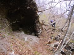 岩洞を右から巻き、林を登って中段の落ち口に向かう。落ち口までの斜面のトラバースしているとき、眼鏡を木の枝に跳ね上げられて落とした。滝の下まで落としたかと焦ったが、足元から僅かに離れた所に落ちているのをHさんに見つけて頂いて、事無きを得る。