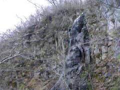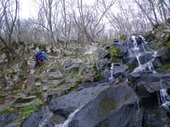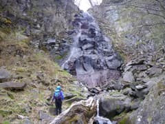 上段の滝は、右も左も高い岩壁が続いていて、簡単には高巻けそうにない。比較的易しそうな右側に取り付いてみる。上段の滝を真横から見ると、岩壁から突き出た黒い岩柱の上を水が流れ落ちている。下から見た感じよりも、実際の落差があるようだ。