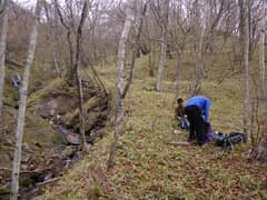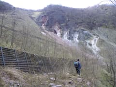 まず、滝の右側の笹の斜面を登ってみたが、脆い岩壁に突き当たり、Mさんが立ち木を頼りに登攀を試みるも根張りが心許なくて危険なので断念(ちなみに、立ち木が頼りになっても危険^^;)。猿川本流に戻ってしばらく遡り、高巻きルートを探索する。本流も源頭に近く、上方にはぼろぼろのガレ場が広がって、滝がかかっているのも見える。