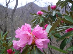 鳥居峠の手前で利平茶屋へ下る歩道に入り、ジグザグに下る。途中、「← 利平茶屋1.4km 鳥居峠0.9km→」の道標がある地点から歩道をちょっと逸れて、小尾根上に付いている踏み跡を辿ってみる。そのまま利平茶屋に下れるかも、と期待して進むが、砂防堰堤を足元遥か下に見る断崖絶壁の上に出て、すごすごと引き返す。途中、見頃のアズマシャクナゲの群落があったのと、鳥居峠の展望が良かったのが道草の収穫でした。