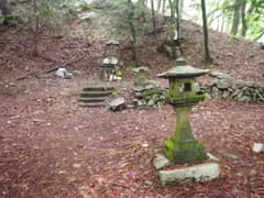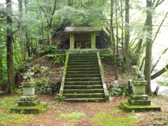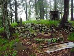 氷室山神社はこの僅か先にある。小さな石祠のある境内の静かな佇まいは相変わらずだ。休憩しているうちに、とうとう雨が降り出した。木の葉が傘になって、すぐには雨滴が落ちて来ないが、本格的な降りに備えてザックにカバーを掛け、雨傘を出して、念のため雨具の下をはく。