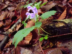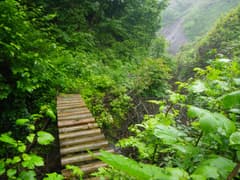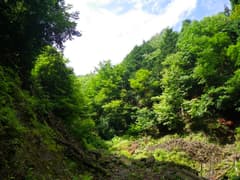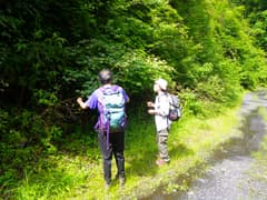 あるときは水流に靴を浸し、あるときは草藪を押し分けて下る。野趣満点で面白いが、盛夏に歩くのは藪が酷いのでお勧めしない。やがて木橋で沢を何回か渡り返す。新しい木橋も架かって、ルート整備の手が入っているようだが、濡れた丸太は非常に滑り易く、慎重に渡る。林道に出た時はホッとした。雨も上がり、青空も広がり始めた。山の天気は本当にコロコロ変わる。