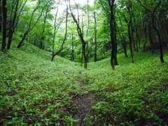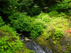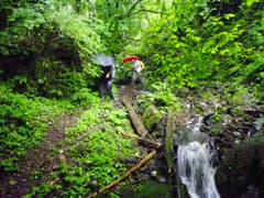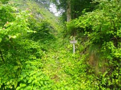黒坂石への沢コースは、緩い笹原から始まる。やがて水流が現われ、沢に沿って下る。木立が切れて陽当たりの良い場所は夏草が繁茂し、踏み跡を覆い隠している。みどり市が昨年5月5日に設置した道標が要所にあり、おかげでコースが確認できる。そのうち、轟然と雨が降り出して、傘を差しての下りとなった。