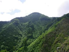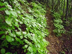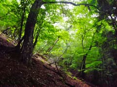 杉林の中の小尾根を登ると、左側が伐採された斜面の上に出て、根本山の頂上が拝める。眺めは良いが、木陰のない尾根上の登りは日差しと湿気で熱射病になりそう。まさに修行、いや、高い山に登る時だって登り始めはこれくらい暑い、などと愚痴り合い慰め合いつつ登る。再び林間に入り、山腹をトラバースすると根本山〜三境山の縦走路が通る主稜線に着いた。反対の桐生市側から爽やかな風が吹き上がって来て、一息つく。やれやれ。