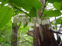 稜線を根本山に向かうと、地面に白い花びらがたくさん落ちている。何だろうと見上げると、木の上にスズランのような白い花がたくさん咲いていた(後日調べると、ネジキという木らしい)。