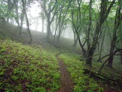 分岐に戻り、氷室山方面に向かう。ますますガスが濃く、険悪な天気になってきたので、中ノ沢林道からエスケープするつもりで降り口を探す。確か木の枝に「中ノ沢林道」という道標が打ち付けられていたはずだ。しかし、道標を見落としたのか、それともなくなってしまったのか、いつの間にか通過して、氷室山の直前まで来てしまった。まあ、氷室山は当初来る計画だったし、Kさんは氷室山は未踏だし、エスケープルートと較べてそんなに遠回りになる訳でもないから、無問題だな(^^;)