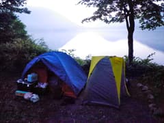 Mさん達がテントを張ったのは木陰から大沼が見渡せる場所で、水場やWCも遠くなく、ベストのテントサイトだ。ここが無料とは素晴らしい。Mさんのテントの横に自分のテントを張って、いつでも寝られる体制にしてから宴会に参入する。Mさん達は3時から飲んでいたそうだ。