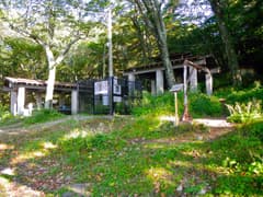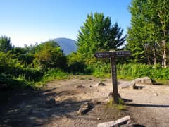 テントを畳んで車に積み込んだのち、キャンプ場の水場近くにある「薬師岳、陣笠山、五輪峠」の道標にしたがって、裏手の林間を登り始める。この道標は木の陰にあるので、ちょっと気が付きにくい。
