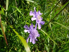程なく到着した陣笠山の山頂は広い平地となっているが、樹林に遮られて展望は乏しい。周囲の草むらにマツムシソウが咲いているのが、秋の気配を感じさせる。