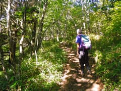 五輪尾根に戻り、縦走を続ける。野坂峠道の大沼側に下る道を分けると緩やかな稜線歩きとなり、出張山(でばりやま)の頂上に導かれる。この頂上は展望が開けて、大沼や黒檜山、辿って来た五輪尾根のまろやかな山々が眺められる。既に太陽が高くなり、日差しを遮るものがない頂上はじりじりと暑いので、先に進もう。